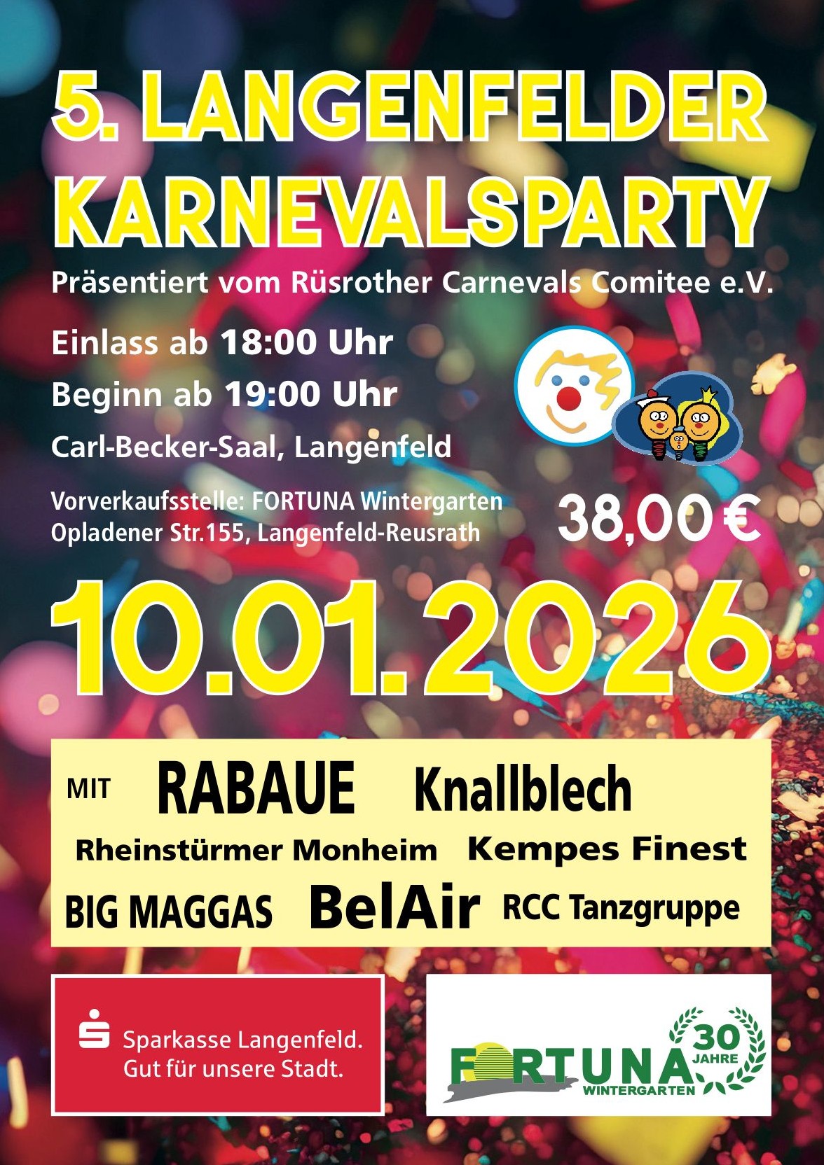 Die 5. Langenfelder Karnevalsparty findet am 10.01.2026 im Carl-Becker-Saal auf der Hitdorfer Straße 10 in Langenfeld statt. Die Party bietet ein über fünfstündiges Programm. Neben den musikalischen und karnevalistischen Größen von Rabaue, BelAir, BIG MAGGAS und Kempes Finest treten noch die lokalen Highlights der Monheimer Tanzgarde die Rheinstürmer, sowie die Tanzgruppe des RCC auf. Zwischen den Live Acts spielt der DJ Karnevalhits. Einlass ist gegen 18.00 Uhr und das offizielle Programm endet gegen 00.00 Uhr. Danach wird unser DJ aber noch weiter für Stimmung im Saal sorgen.